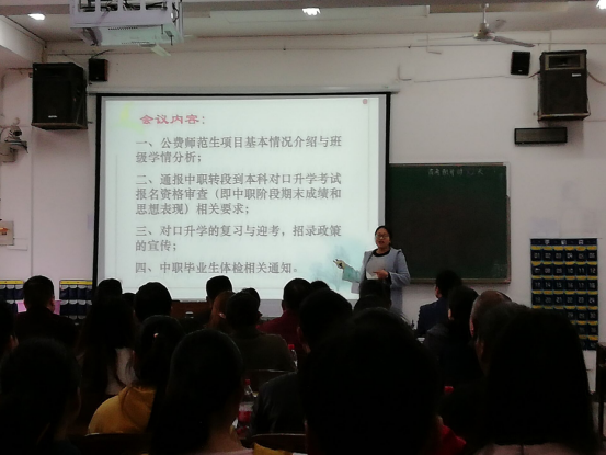 班主任就公司公费师范生项目基本情况进行了介绍,对各自班级进行了学情分析,向家长们通报了员工的学业成绩及在校表现;对2017级公费师范生中职转段到本科对口升学考试报名资格审查相关要求及复习迎考工作作出了具体说明。