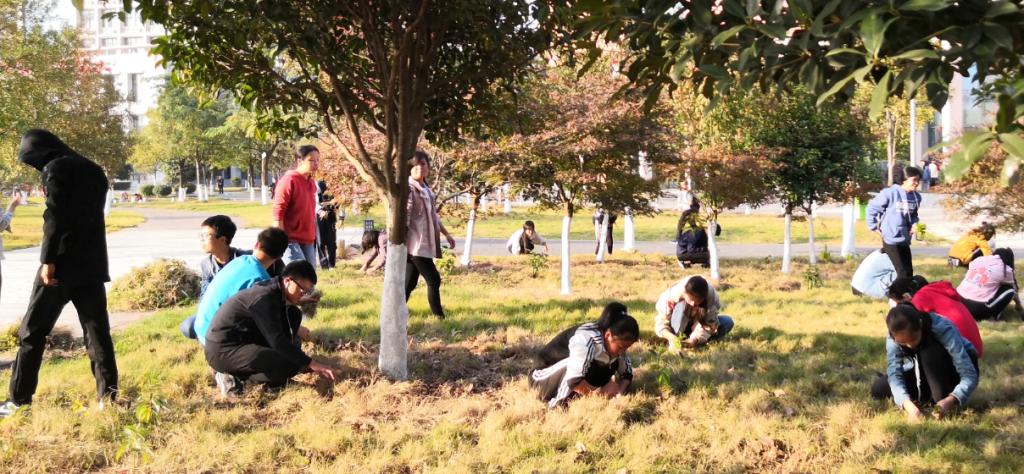 同学们拔草的时候都非常认真,他们挥洒着汗水,一粒粒的汗珠形成了一道道美丽的彩虹,在美丽的校园的映衬之下他们一个个蹲下去的身影形成了一道道靓丽的风景线。有较为胆小的女同学不敢进到树丛中捡垃圾,胆大的男同学主动请缨去捡垃圾,时而互相开开玩笑,时而嬉笑。杂草的生命属实顽固,一不小心同学的手就被划开一道小口,所以难免受伤。其间隐约听到女孩子的小声抱怨,紧接着是同学之间关心的话语,女同学慢慢平静下来,再慢慢找到了些拔草的技巧,有说有笑的又拔起了草。