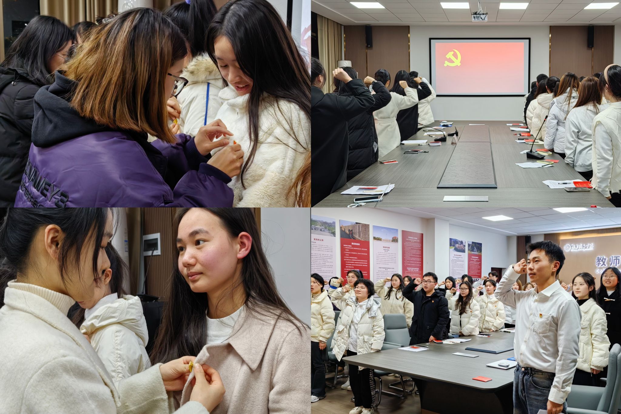 在庄严的党旗下,老党员为新党员佩戴党徽、分发党员手册,新党员庄严宣誓。